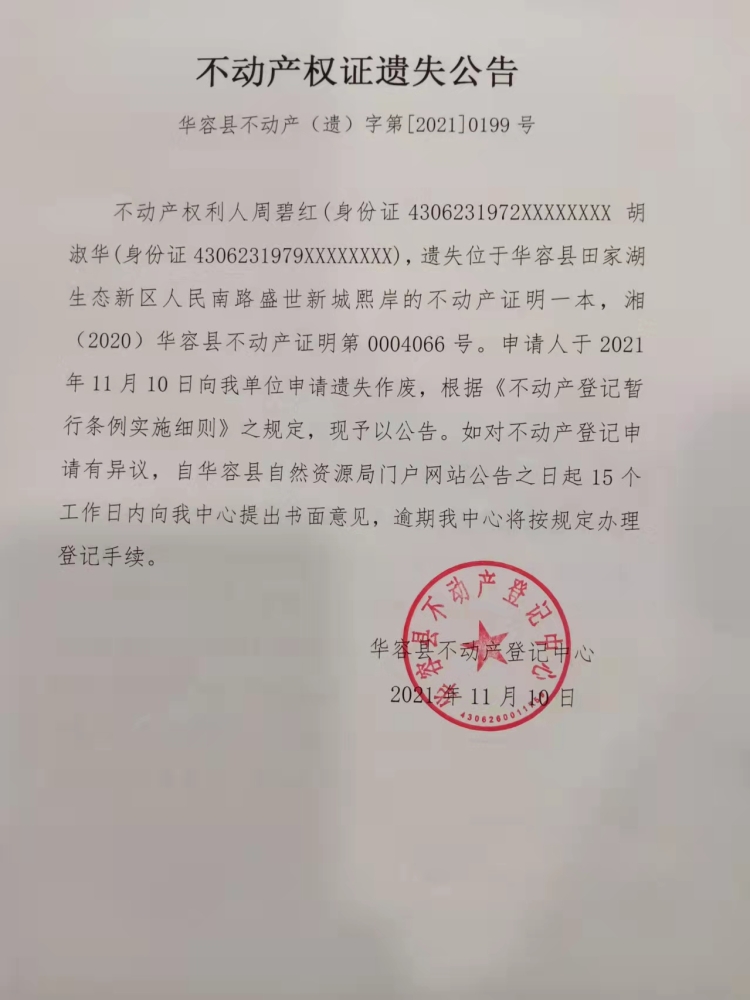 不动产权证遗失公告【不动产权证明(周碧红)】
