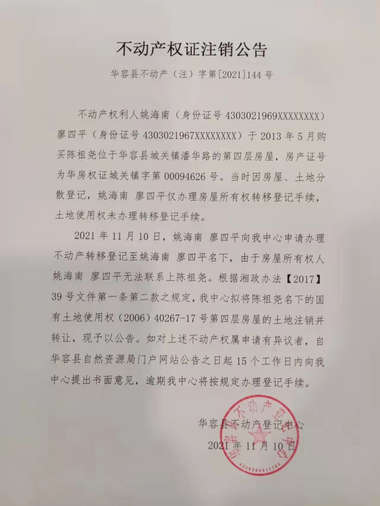 不动产权证书注销公告【(陈祖尧转姚海南、廖四平)】