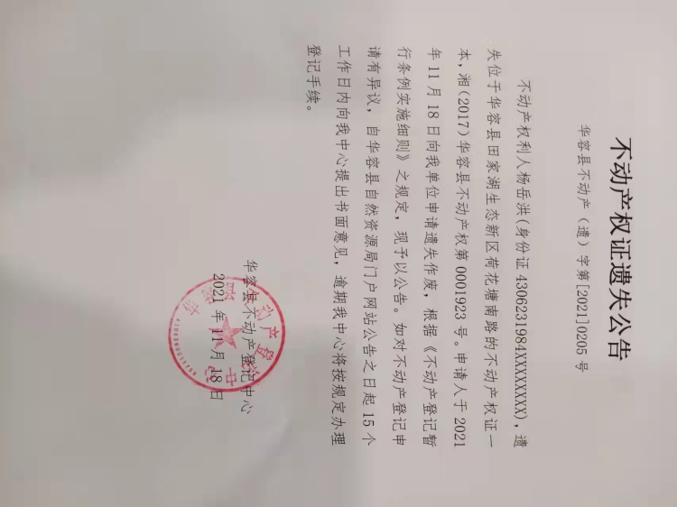 不动产权证遗失公告【不动产权证(杨岳洪)】