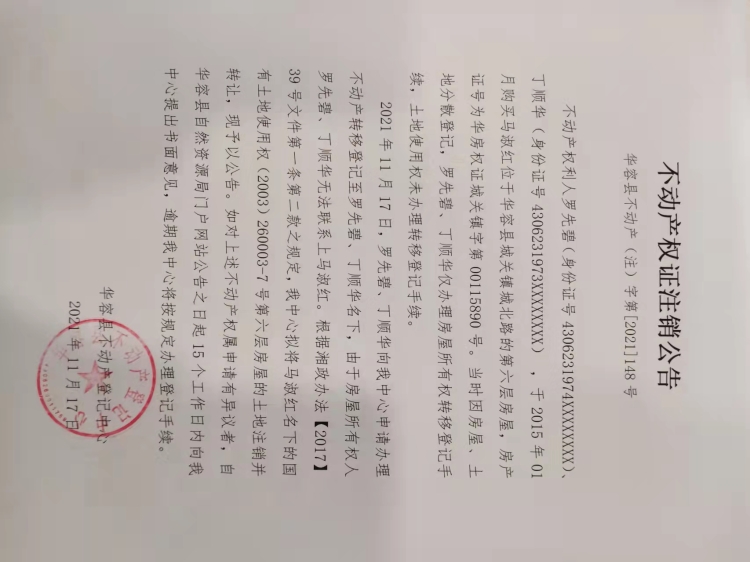 不动产权证书注销公告【(马淑红转罗先碧、丁顺华)】