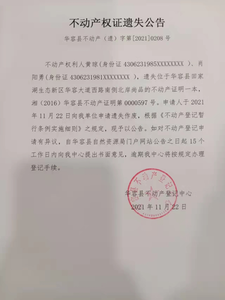 不动产权证遗失公告【不动产证明(黄琼、肖阳勇)】