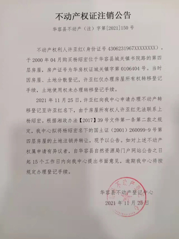 不动产权证书注销公告【(杨绍宏转许亚红)】