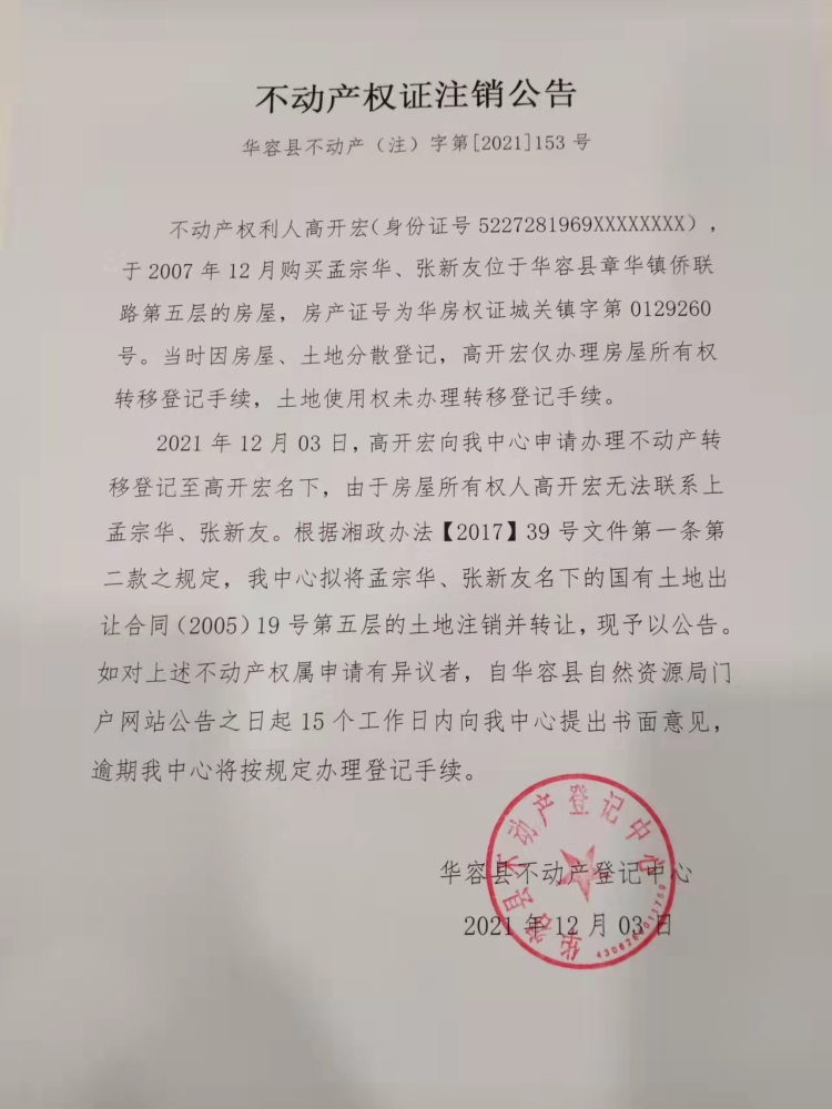 不动产权证书注销公告【(孟宗华、张新友转高开宏)】