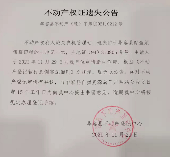 不动产权证遗失公告【国土证(城关农机管理站)】