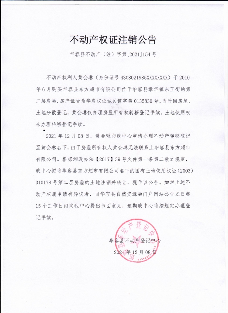 不动产权证书注销公告【(华容县东方超市有限公司转黄会琳)】