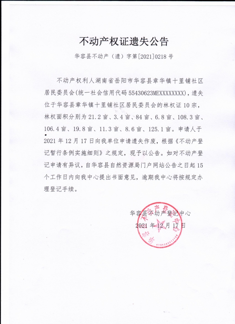 不动产权证遗失公告【林权证(湖南省岳阳市华容县章华镇十里铺社区居民委员会)】