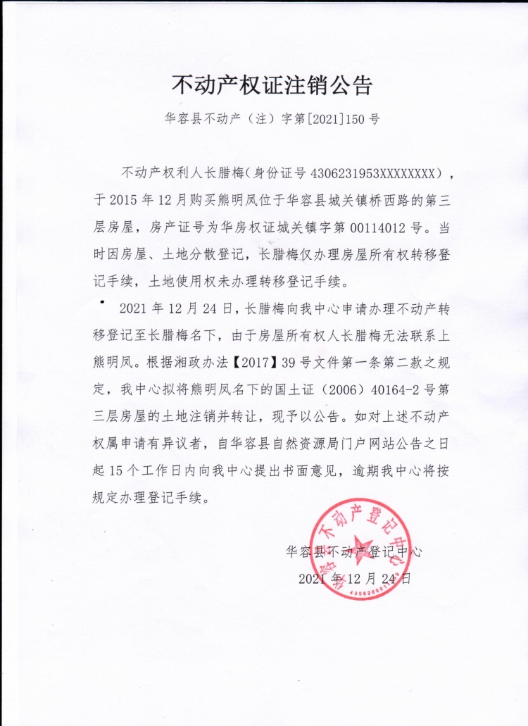 不动产权证书注销公告【(熊明凤转长腊梅)】