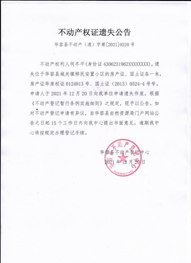 不动产权证遗失公告【国土证 房产证(何冬平)】