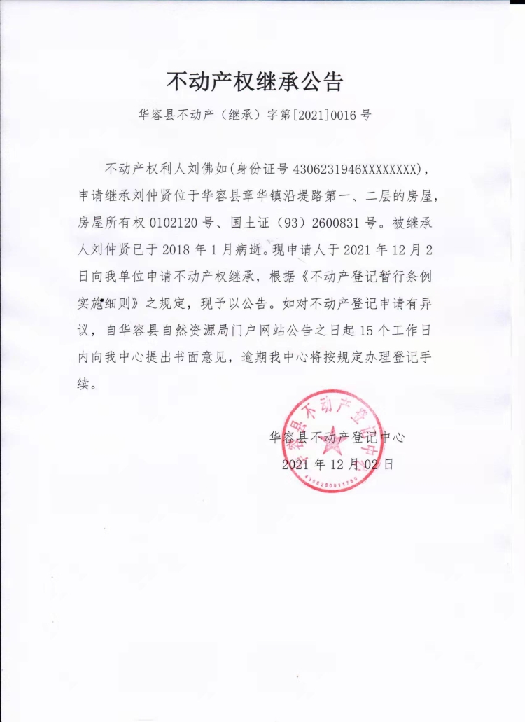 不动产权继承公告【(刘仲贤转刘佛如)】