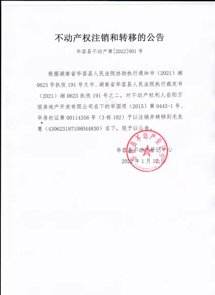 不动产权证书注销和转移公告【(岳阳万丽房地产开发有限公司转毛良惠)】