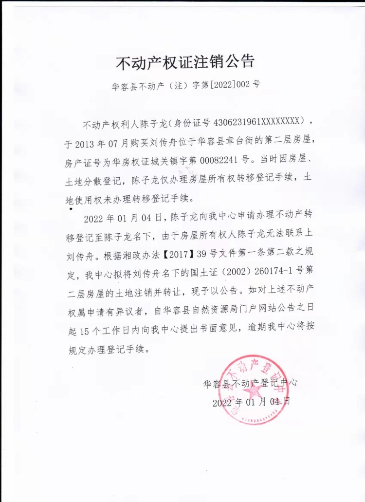 不动产权证书注销公告【( 刘传舟转陈子龙)】