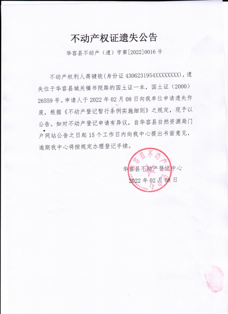 不动产权证遗失公告【国土证 (蒋键铣)】