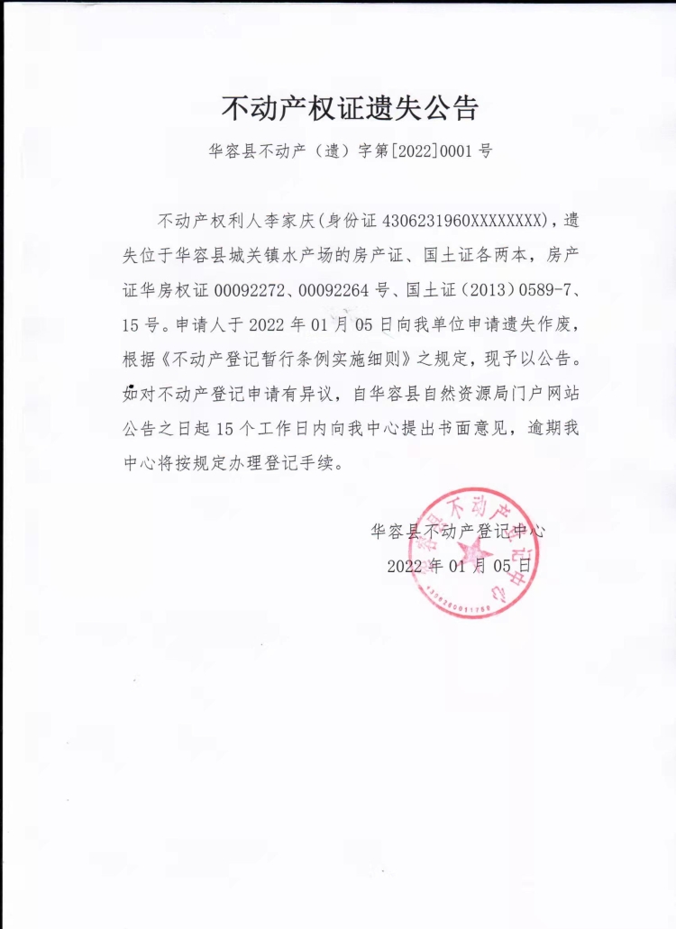 不动产权证遗失公告【国土证 房产证 (李家庆)】