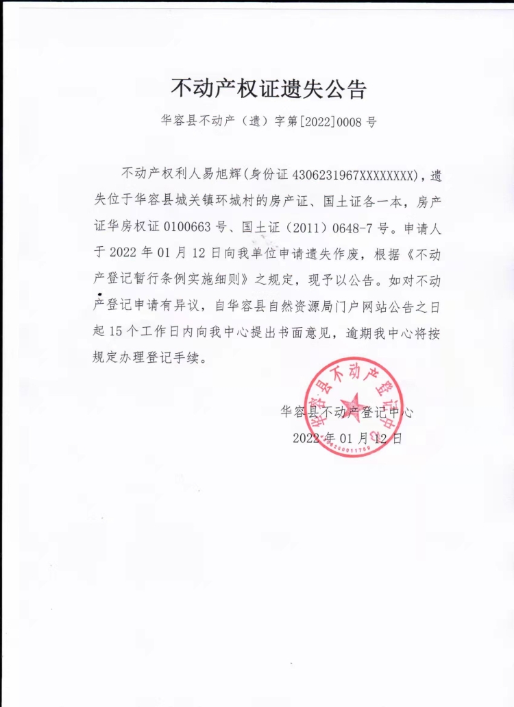 不动产权证遗失公告【国土证 房产证 (易旭辉)】