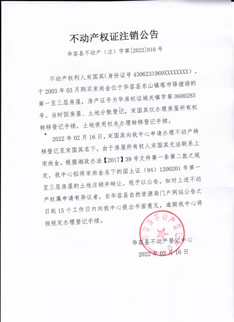 不动产权证书注销公告【(宋尚金转宋国其)】