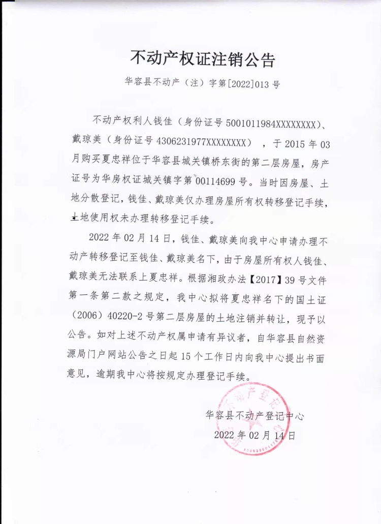 不动产权证书注销公告【(夏忠祥转钱佳、戴琼美)】
