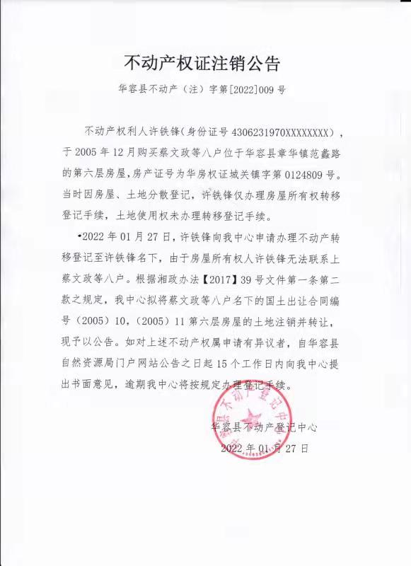 不动产权证书注销公告【(蔡文政等八户转许铁锋)】