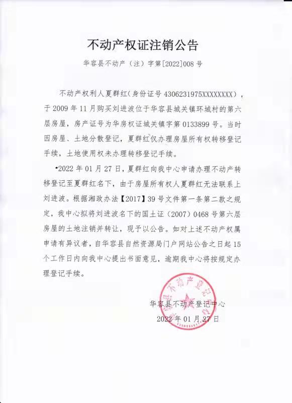 不动产权证书注销公告【(刘进波转夏群红)】