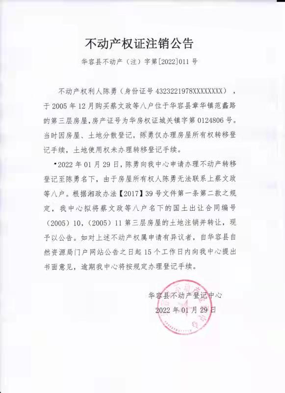 不动产权证书注销公告【(蔡文政等八户转陈勇)】