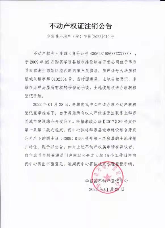 不动产权证书注销公告【(华容县城市建设综合开发公司转李雄)】