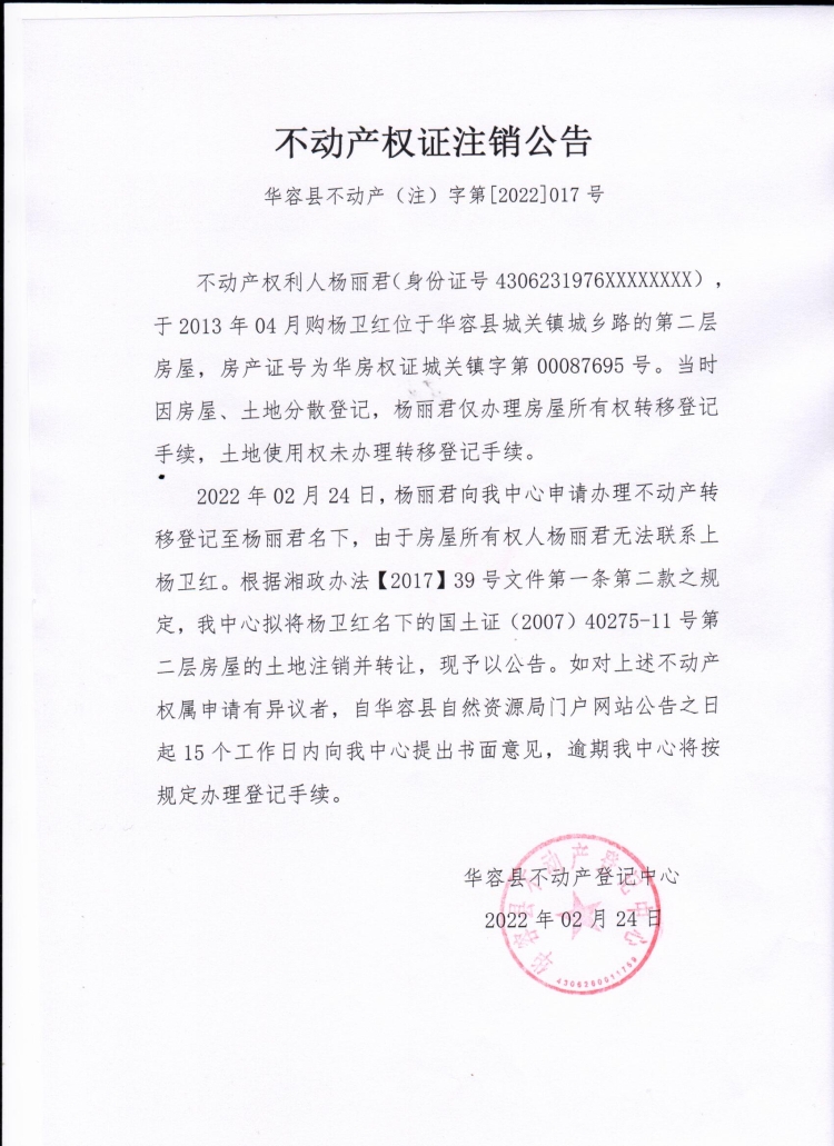 不动产权证书注销公告【(杨卫红转杨丽君)】
