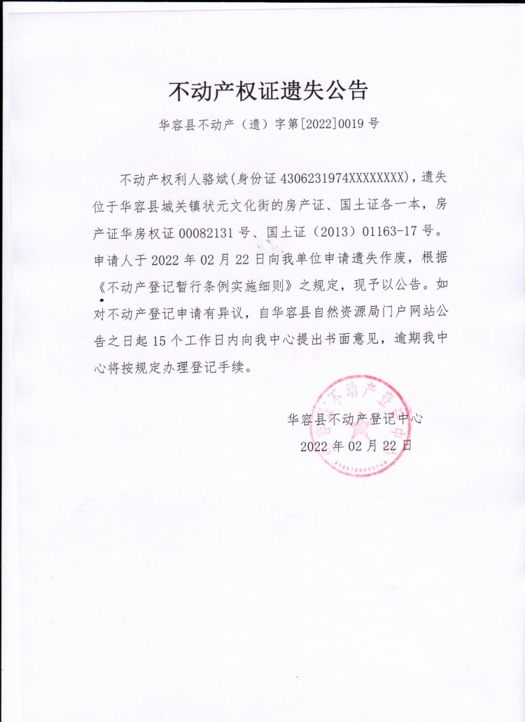 不动产权证遗失公告【国土证 房产证(骆斌)】