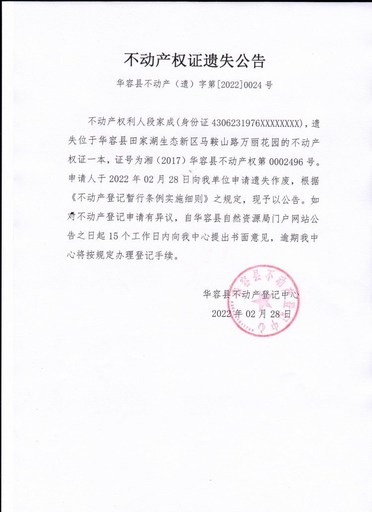 不动产权证遗失公告【不动产权证(段家成)】