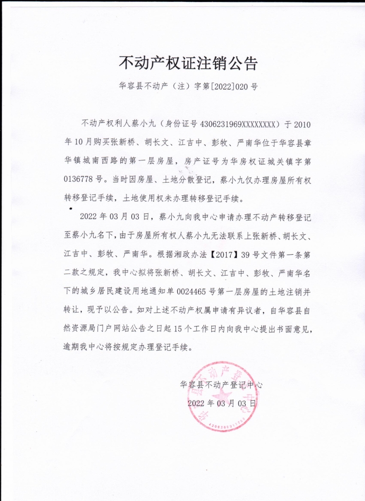 不动产权证书注销公告【(张新桥、胡长文、江吉中、彭牧、严南华转蔡小九)】