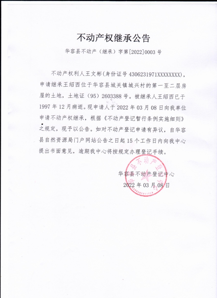 不动产权继承公告【(王绍西转王文彬)】