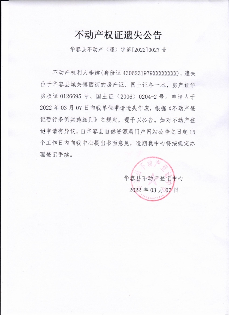 不动产权证遗失公告【国土证 房产证(李嫦)】