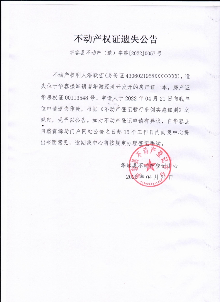 不动产权证遗失公告【房产证(潘跃宏 )】