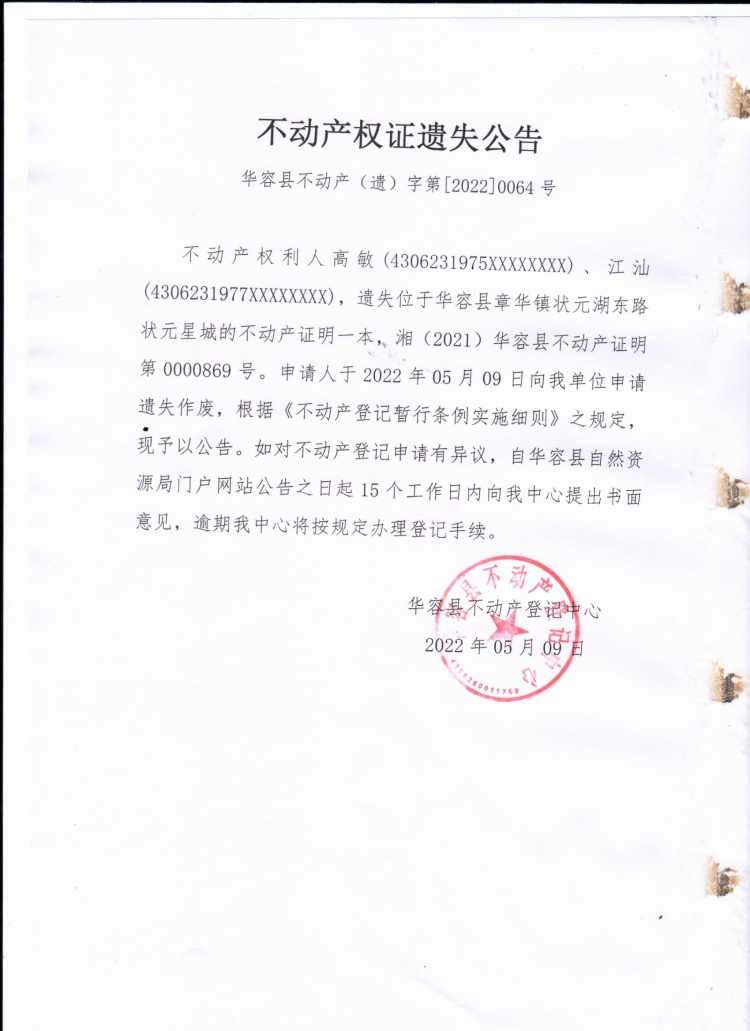 不动产权证遗失公告【不动产证明(高敏、江汕)】