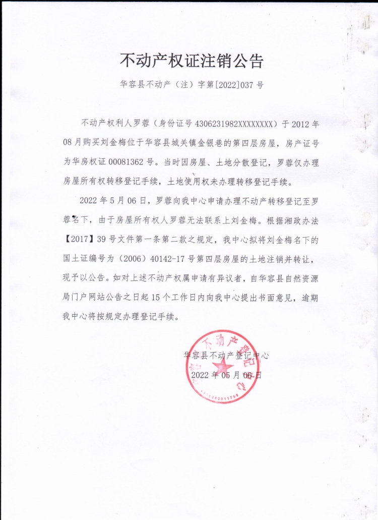 不动产权证书注销公告【(刘金梅转罗蓉)】