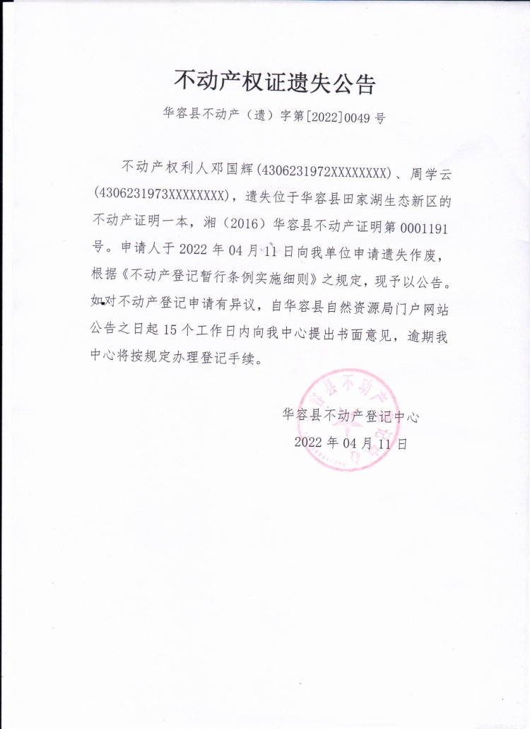 不动产权证遗失公告【不动产证明(邓国辉、周学云)】