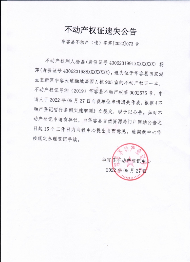 不动产权证遗失公告【不动产权证(杨磊)】