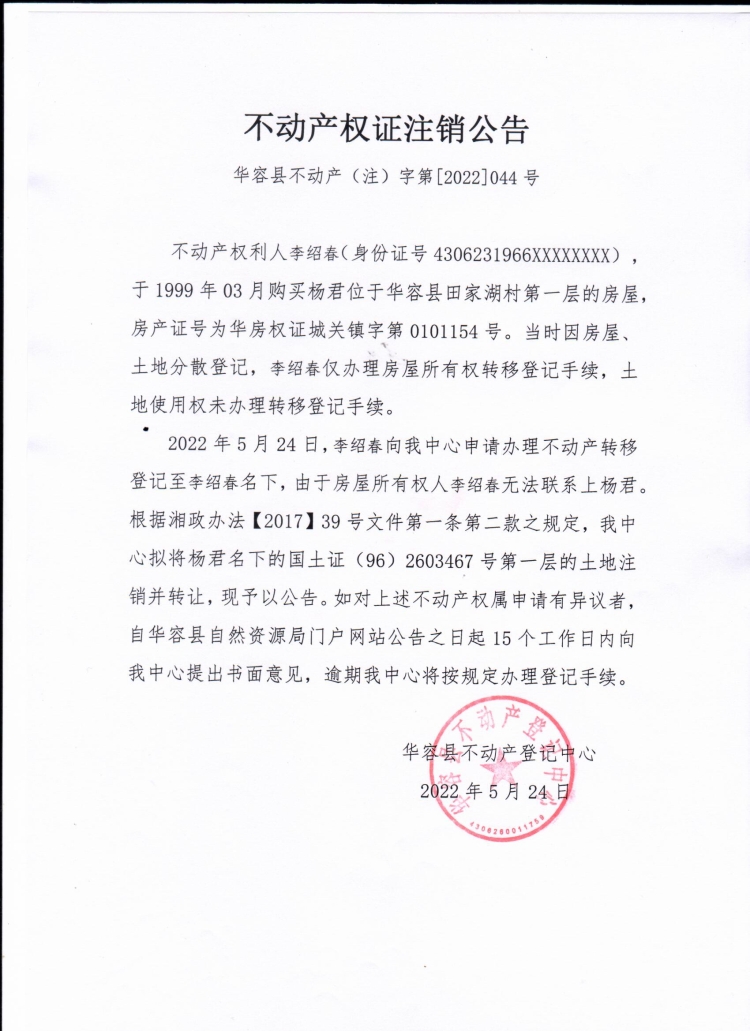 不动产权证书注销公告【(杨君转李绍春)】