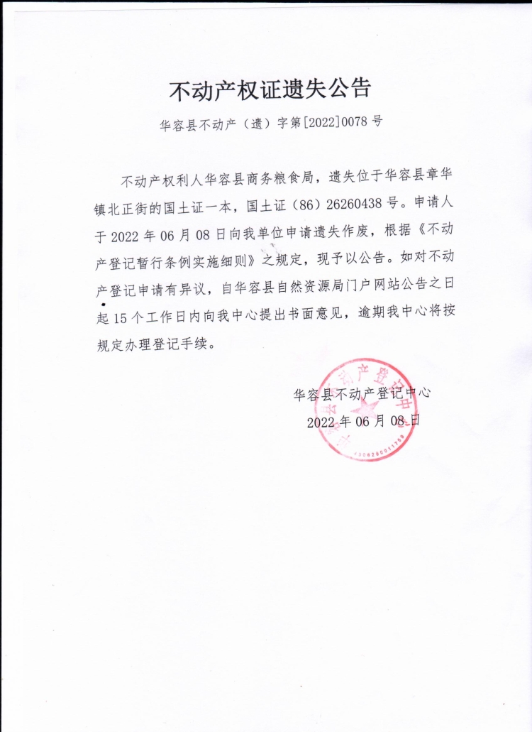 不动产权证遗失公告【国土证 (华容县商务粮食局)】