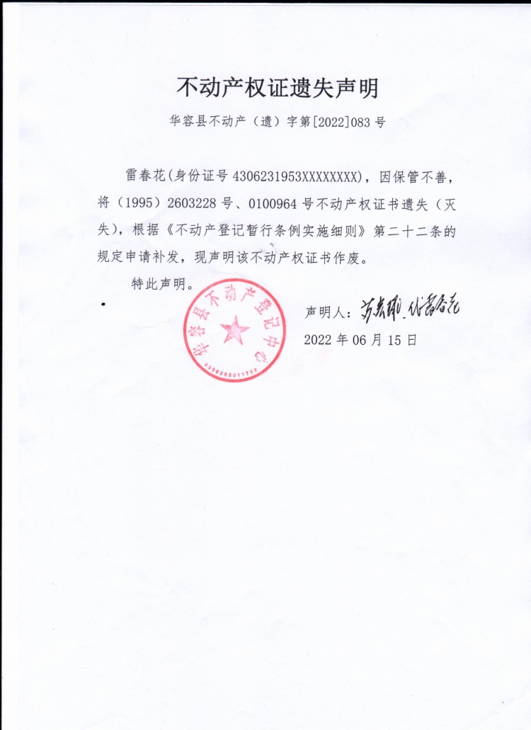 不动产权证遗失声明【(雷春花)】
