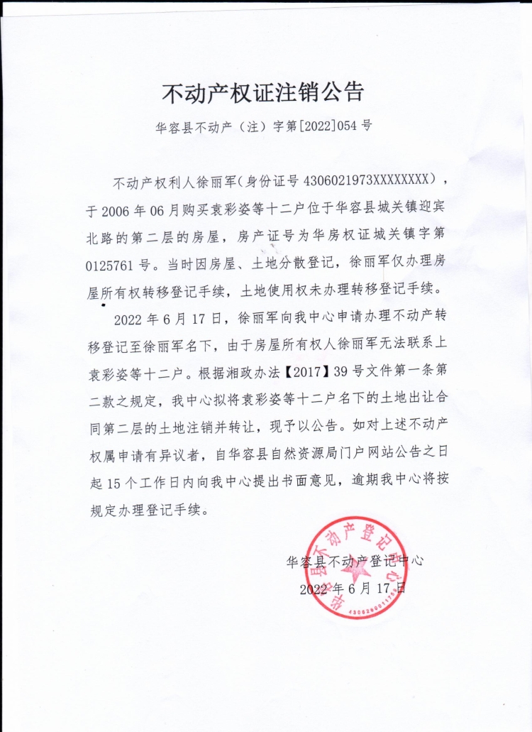 不动产权证书注销公告【(袁彩姿等十二户转徐丽军)】