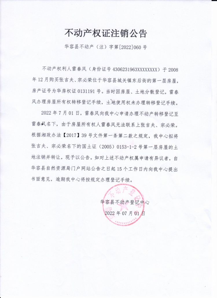 不动产权证注销公告(张吉夫、宗必荣转雷春风)