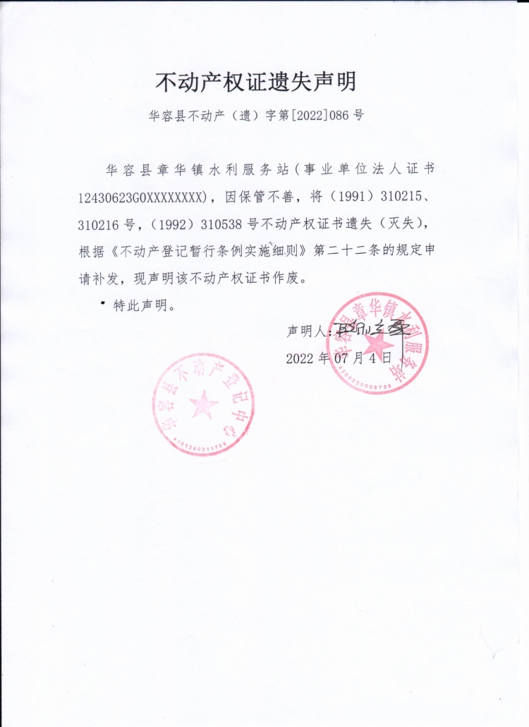 不动产权证遗失声明(华容县章华镇水利服务站)