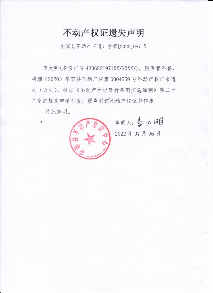 不动产权遗失声明(李大明)