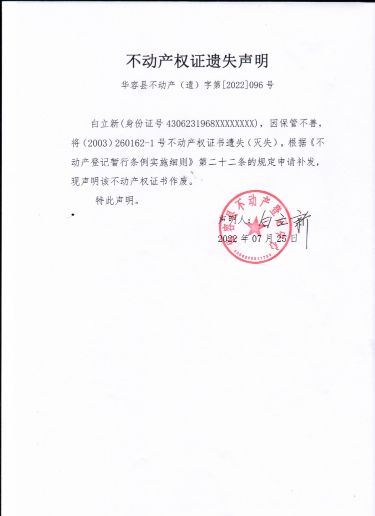 不动产权证遗失声明(白立新)
