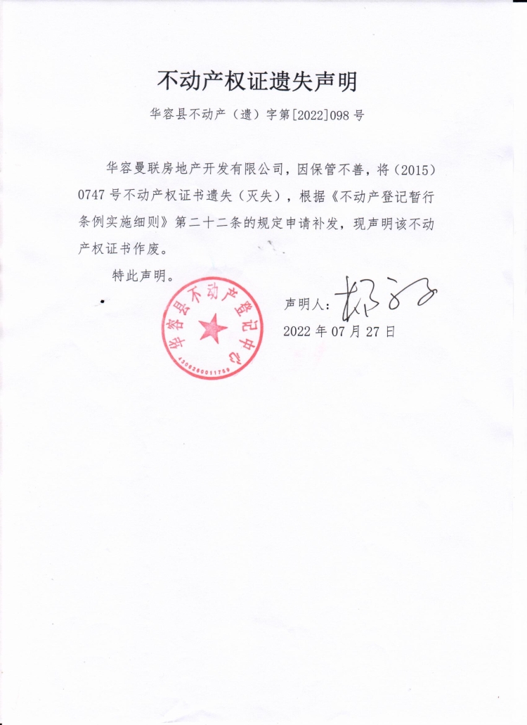 不动产权证遗失声明(华容曼联房地产开发有限公司)