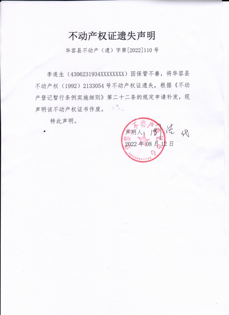 不动产权证遗失声明(李连生)