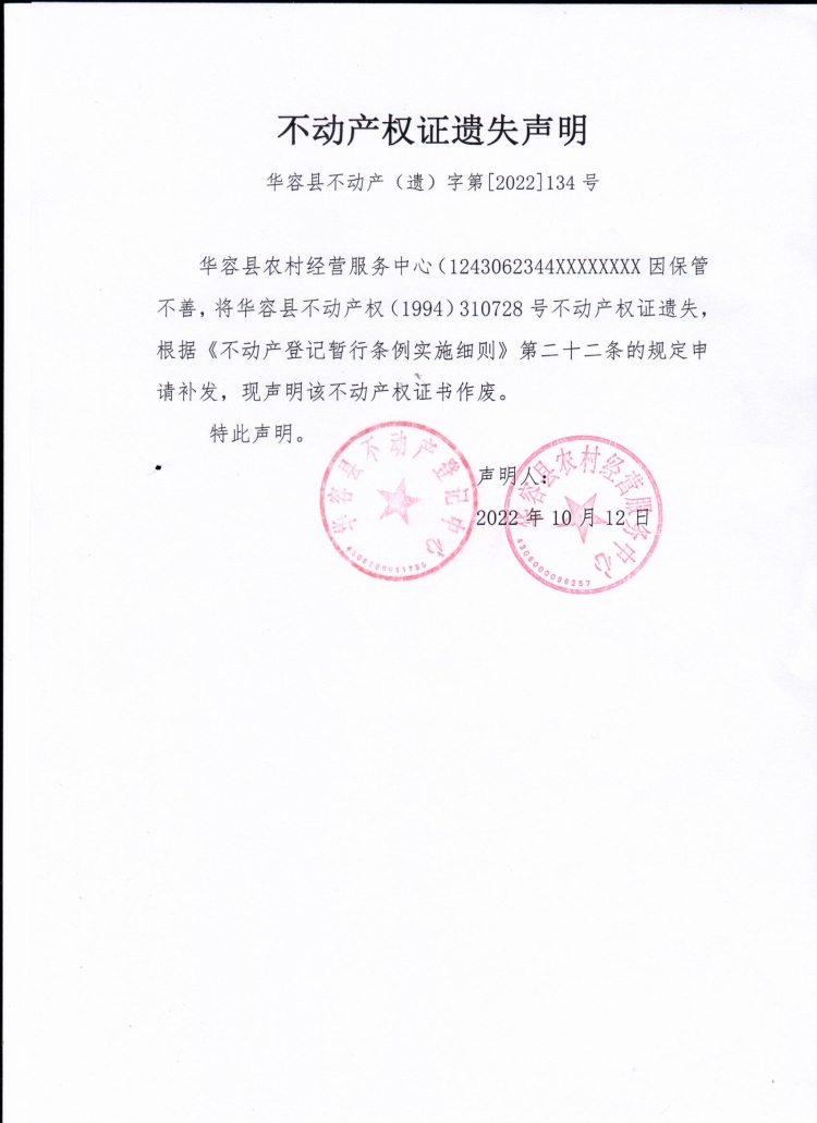 不动产权证遗失声明(华容县农村经营服务中心)
