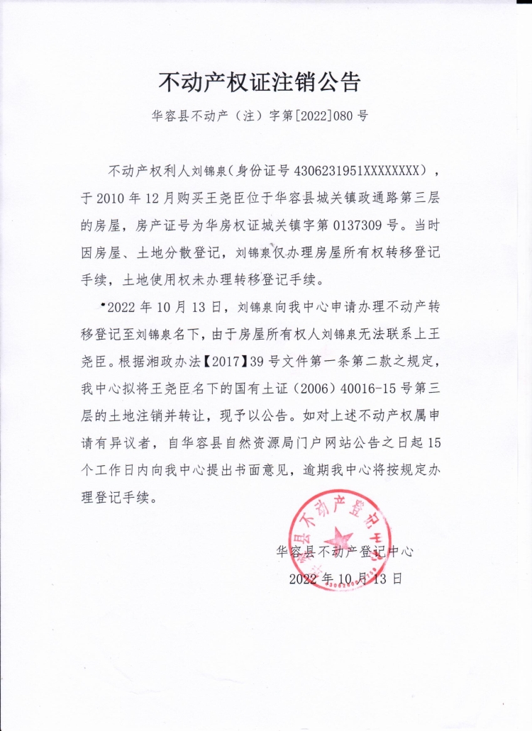 不动产权证注销公告(王尧臣转刘锦泉)
