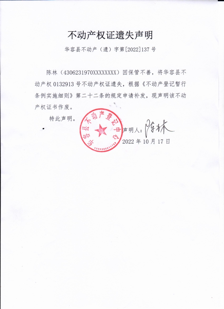 不动产权证遗失声明(陈林)
