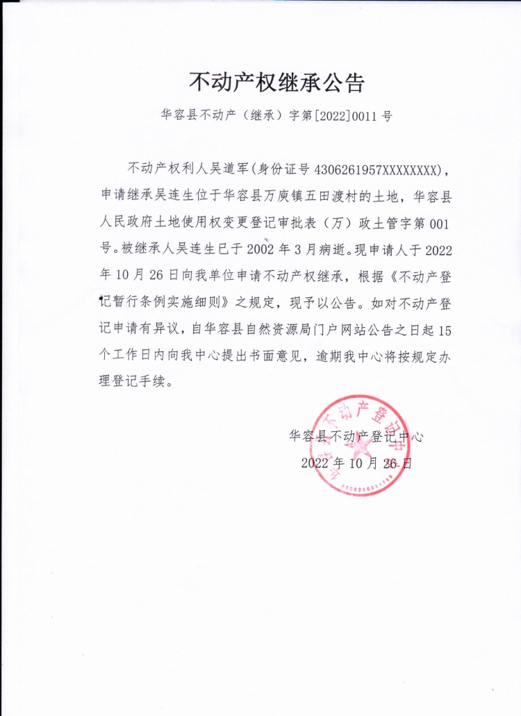 不动产权继承公告(吴道军)