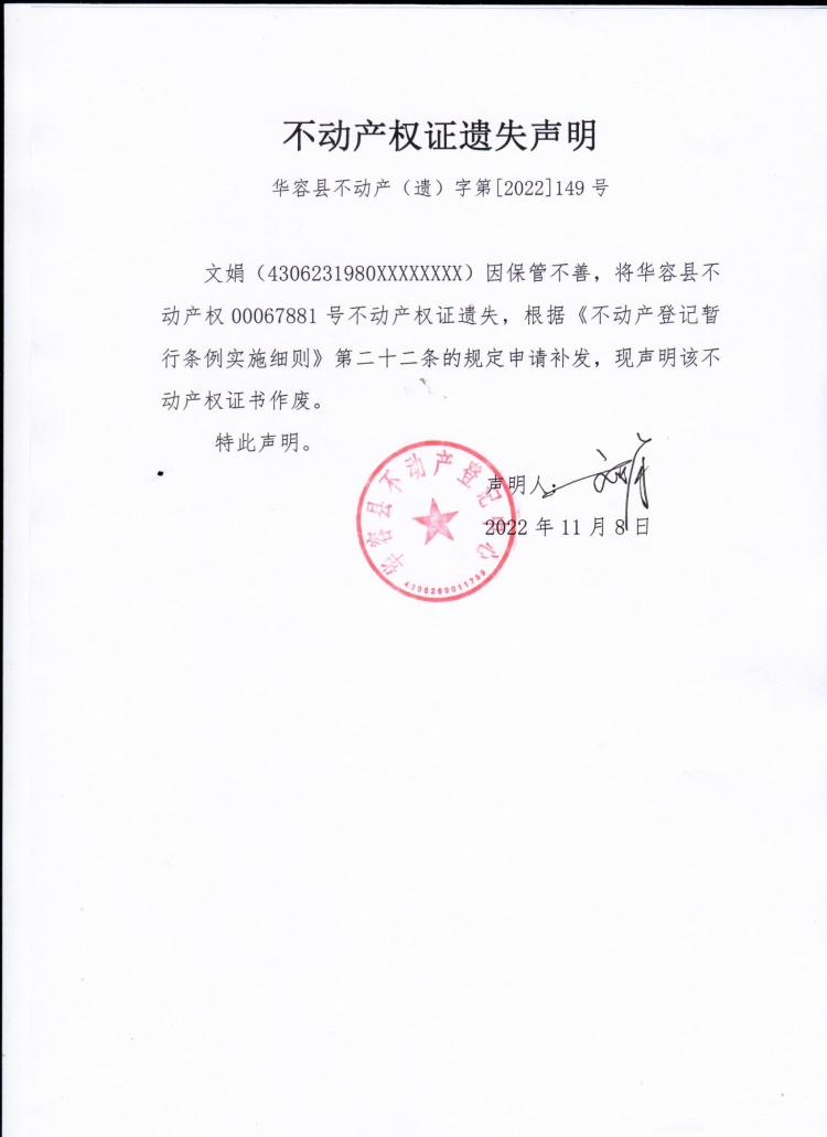 不动产权证遗失声明(文娟)